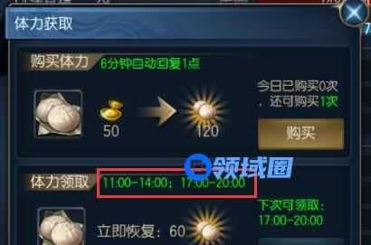 每日两个时段(11:00~14:00,17:00~20:00)内可在体力获取界面领取60点体力。