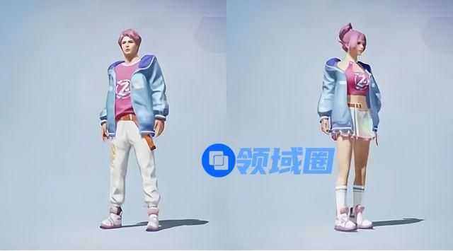 首先看一下这套人物皮肤套装,这套人物皮肤套装的造型还是非常不错的。可以看到男女款都是同样都是粉色发型,同样的蓝色夹克外套。而内衬也是粉色的,不过在粉色内衬上印着一个《和平精英》2周年的标志!男款下半身是白色长裤,女款则是白色短裙。不过笔者最喜欢的还是女款的发型,虽然扎着马尾,但是仔细看可以发现,不过后面的马尾却是卷发,再加上是粉色的发色非常好看!