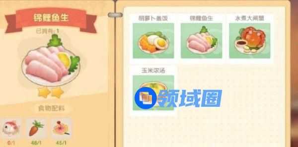 锦鲤鱼生是一个2星的料理,制作所需的材料有:锦鲤*1、胡萝卜*1、毛毛花*1。玩家厨师等级达到5级以后,就可以解锁并制作 这个料理了。