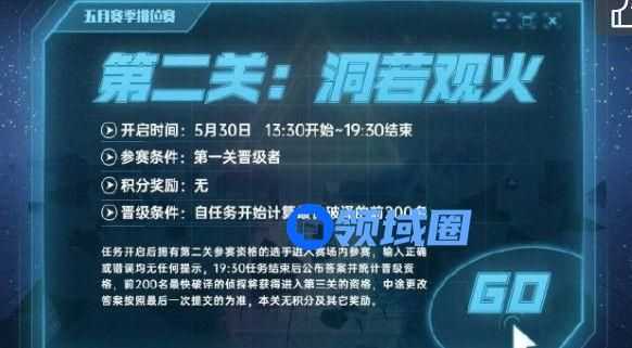 任务开启后拥有第二关参赛资格的选手进入赛场内参赛,输入正确或错误均无任何提示,19:30任务结束后公布答案井统计晋级资格。