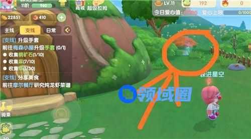 首先伐木林就在【家园小屋】的右边的传送阵,当你等级升到【9阶】就会解锁,也就是初次解锁伐木林的时候,梅森NPC所站的位置,如下图所示。