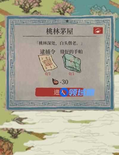 桃林茅屋是江南百景图江南大盗活动中的关键地点之一,而想要进入桃林茅屋需要玩家提交逮捕令和缝好的手帕道具。