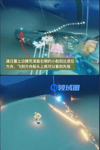 通过墓土边陲荒漠最右侧的小船到达遗忘方舟,飞到方舟船头上就可以看到先祖