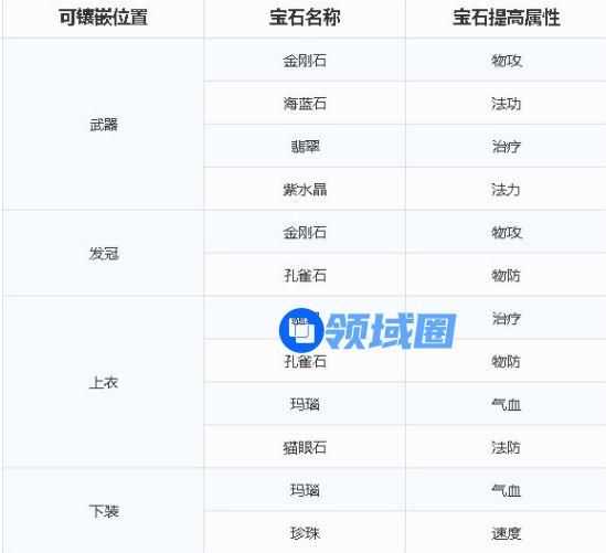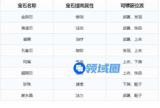 目前游戏内一共有8种宝石,它们分别是金刚石、海蓝石、翡翠、孔雀石、玛瑙、猫眼石、珍珠、紫水晶,其中并没有提高封印强化的宝石。人物装备一共6个部位,它们分别是武器、发冠、上衣、下装、饰品、鞋子。而每个部位能镶嵌的宝石也是有所区别的,具体如下图所示: