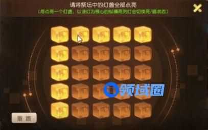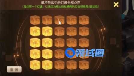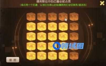 玩家需要将祭坛中的灯盏全部点亮(每点亮一个灯盏,以该灯为核心的纵横两列灯会切换亮状态)