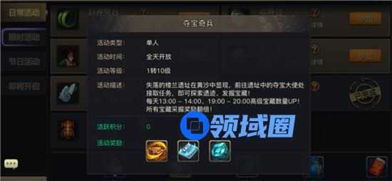 2、每天的13:00~14:00、19:00~20:00期间,高级宝藏的数量加倍,所有宝藏采集奖励将会翻倍。