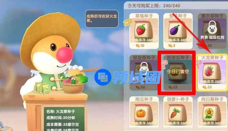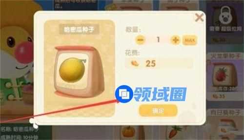 哈蜜瓜种子是在npc梅森的种子商店里购买,每天限购20个,哈蜜瓜成长时间10分钟。