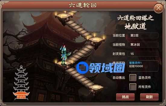 六道轮回是非常经典的爬塔系统,玩家依靠自身实力挑战每层的怪物获取奖励。奖励包括经验及封灵。