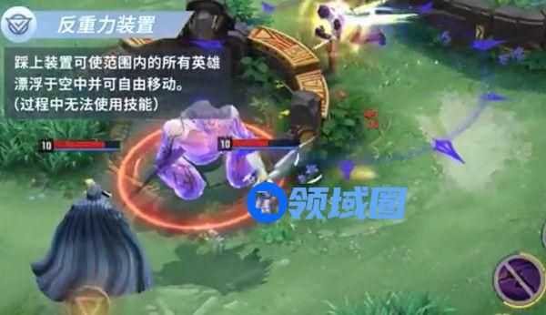 当英雄踩上装置后,会使范围内敌我双方所有英雄短暂漂浮于空中,漂浮过程中可自由快速移动,可跨越墙体阻拦,但无法使用技能。英雄们可以借助反重力装置快速进攻或摆脱敌人的追杀。