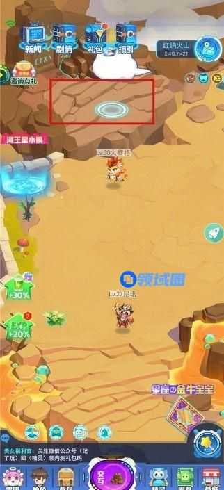 1.来到红纳火山的左上角,能看到一块巨石,不过这里需要坐骑或浮空术才能过的去,坐骑在商城购买,浮空术在晨曦谷学习获得。