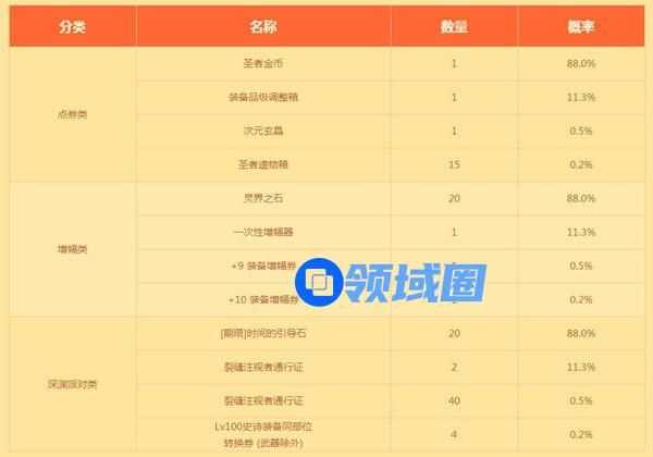 增幅类 : +10 装备增幅券 1张、 +9 装备增幅券 1张、 一次性增幅器 1个、 灵界之石 20个