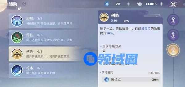 辅助技能目前包括了有幻形、药性、列阵、符术。