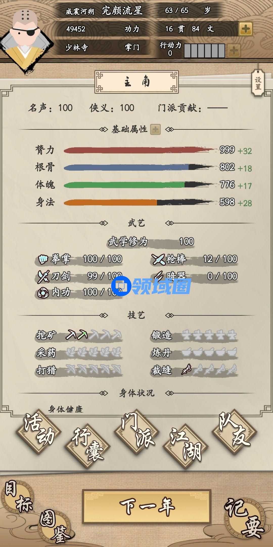 3.提升武功上限不要急,少林的话按着剧情走到了时间自动提升,其实好像就是学会一个武功就加10点,因为只能学10种,上限100点。