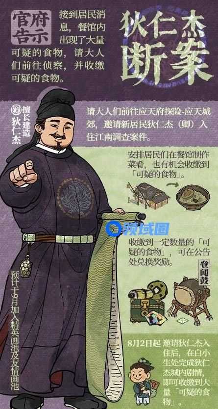 8月2日起,邀请狄仁杰入住后,在白小生处完成狄仁杰城内剧情,即可收缴到大量「可疑的食物」。