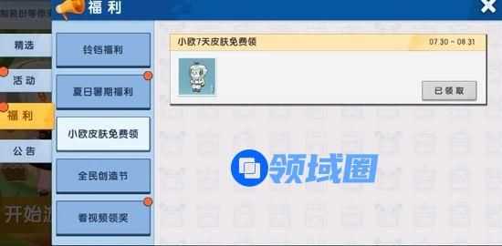 3、大家也可以在福利中领取到小欧7天皮肤免费领,如上图所示领取入口,不过这个是有时间限制的。
