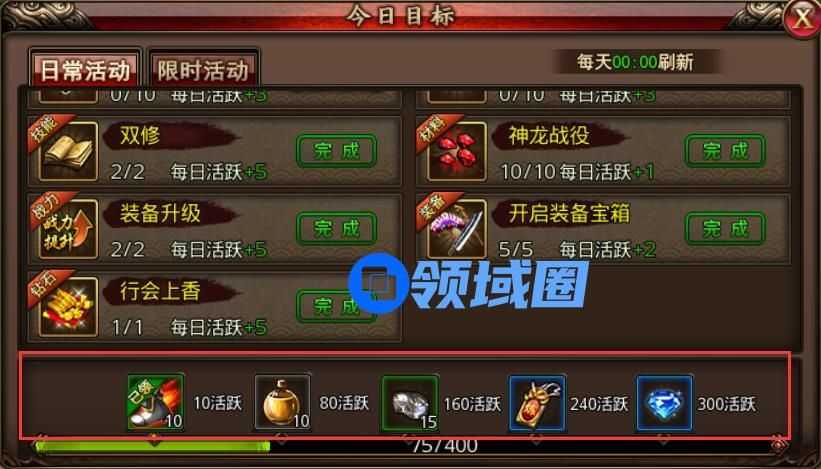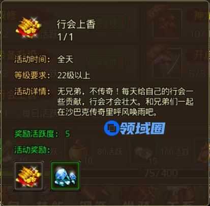 完成行会上香还可以获得5点活跃值。不同活动对应的活跃值可以在【今日目标】中查看,达到相应的活跃值可以获得小飞鞋、强效太阳水、黑铁矿石、试炼凭证和大量钻石。
