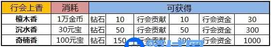 兄弟,行会上香一天一炷,千万别忘了。上香可以获得钻石,行会贡献,并且能给咱们行会增加行会资金。不同的香获得的奖励不一样。我已经为你整理出简洁易懂的表格,怎么样,有没有爱上我?