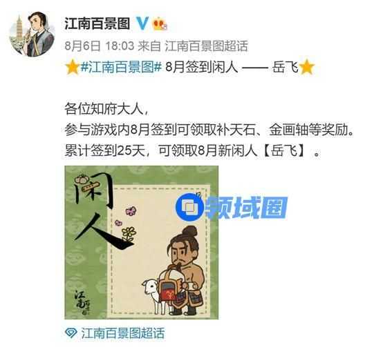 8月6日,“江南百景图”官宣了一个游戏人物——“闲人”岳飞。