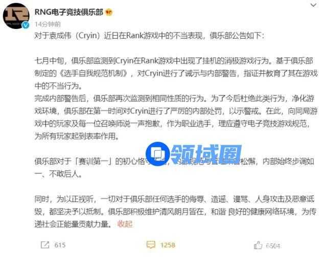 对于网上铺天盖地的质疑声,RNG战队终于坐不住了,官方亲自下场对cryin进行了处罚,可惜这个处罚反而引起了质疑。