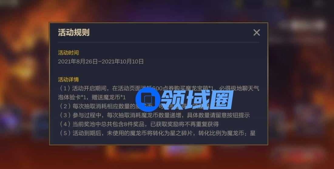 魔龙之巢是一个限时的卡池活动,玩家在卡池中消耗「魔龙币」进行抽奖即可获得奖励,每次抽奖不会重复获得已有的道具,但是价格会逐渐递增,抽满8次可以拿到卡池中全部的奖励道具。