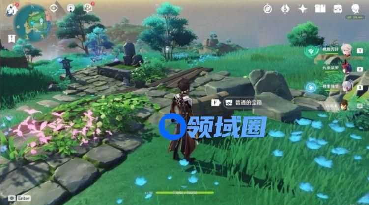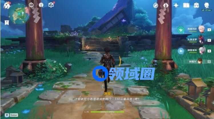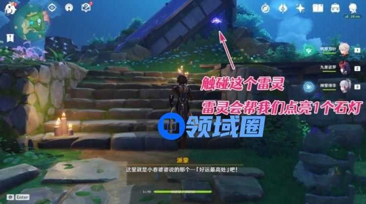 四下环顾这所谓的「好运最高处」,似乎也只有周围这一圈石灯有些突兀,不如我们尝试把这些石灯点亮看看吧。不过附近并没有雷樱枝条,因此我们需要用雷灵来解锁石灯。