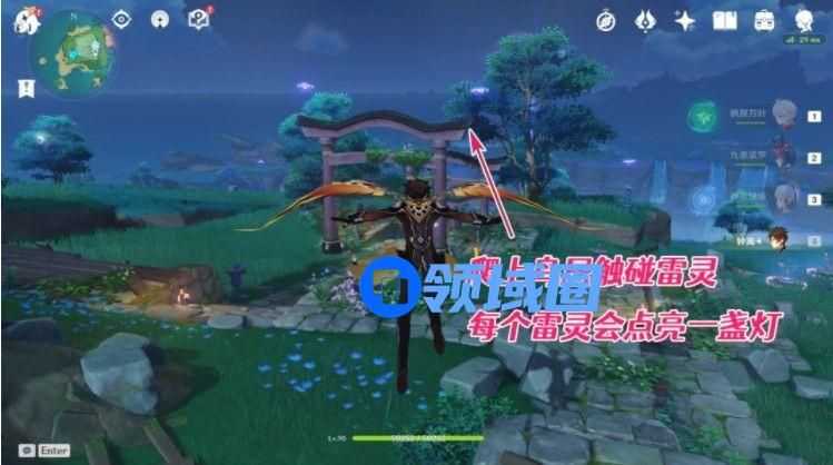 雷灵1触碰完成之后,就会出现雷灵2、3,在鸟居顶上,触碰后分别再为我们点亮1个石灯: