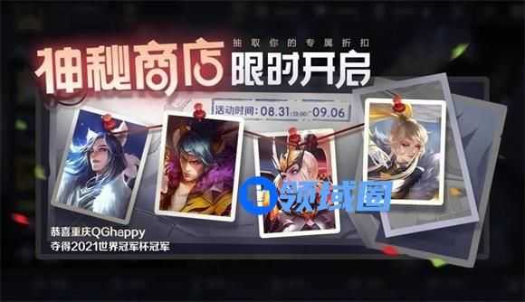 恭喜重庆QGhappy获得2021世界冠军杯总冠军,神秘商店即将开启,李白-千年之狐、韩信-街头霸王等热门皮肤已加入本期神秘商店,各位召唤师赶快来抽取属于你的专属折扣和物品吧!