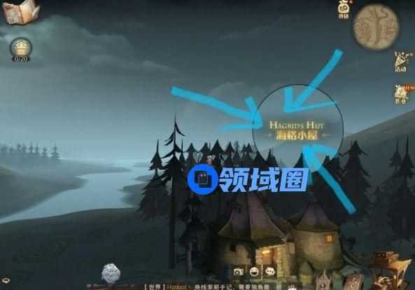 首先是推荐玩家看一看下面的这一张图片,这个就是npc的位置,大地图进图去海格小屋,注意飞过去的时候看见海格小屋那几个黄色的字,点击一下就能进去了,还是非常简单的就可以完成啦;