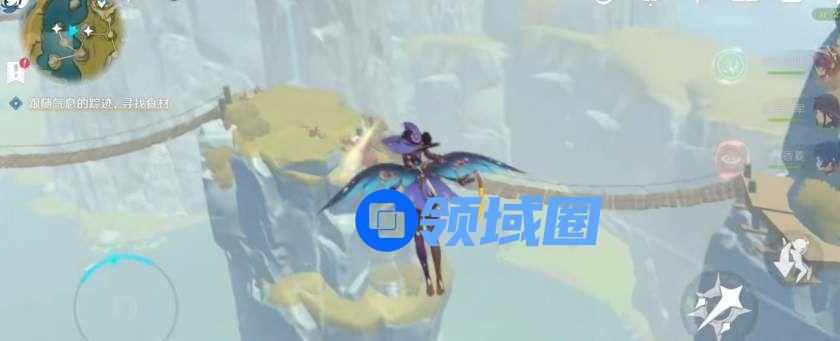 1、在与留云借风真君完成对话后,在任务区域会有金色的风痕一样的指引,沿着地图上的金光反方向飞,借助风场起飞到达下图所示的两座桥中间的山崖上。