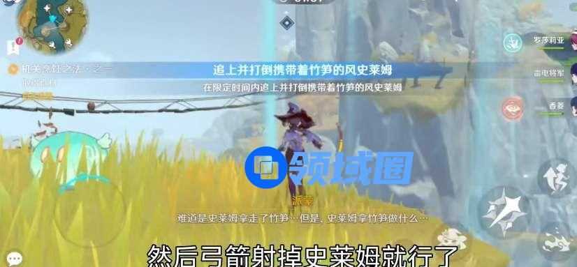 在和留云借风真君完成对话之后,在任务区域就会出现指引,沿着地图上的金光反方向飞,然后借助风场到达下面两座桥的中间山崖上,到达之后任务就会刷新,玩家击败三只史莱姆,并拿回竹笋就能完成任务,然后就去找留云借风真君回报,就能获得奖励了。