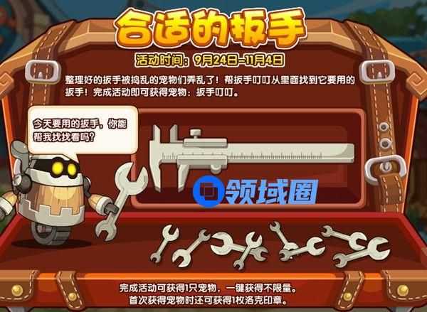 优秀的修理小能手当然需要拥有一把合适的修理工具!但是整理好的扳手被捣乱的宠物们弄乱了!帮扳手叮叮从里面找到它要用的扳手!完成活动即可获得宠物:扳手叮叮。
