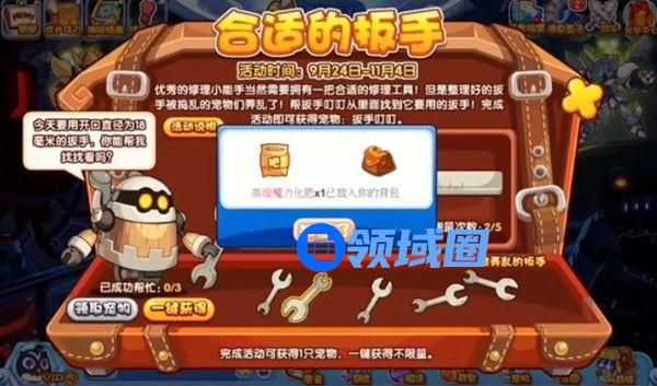 成功帮忙3次即可完成活动获得宠物:扳手叮叮。