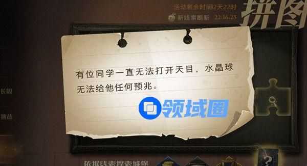这个线索中提到了天目和水晶球,相信很多玩家会很快联想到占卜,于是确定这个拼图碎片应该是在占卜课教室。