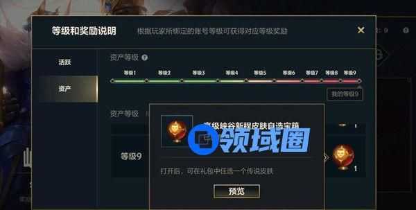 最高资产等级为9级,能获得所有的端游绑定奖励,里面就有高级峡谷新程皮肤自选宝箱,打开后,可以在礼包中任选一个传说皮肤。