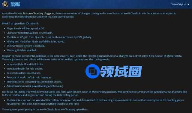 根据暴雪发布的公告可以看出,这次魔兽世界“轮回服”美服公测的等级上限为30级,另外还针对了不少此前怀旧服中的通病做出了些许改变。譬如增加了矿点、草药点,另外还有PVP荣誉系统、战歌峡谷也同步启用,从这些设定来看,“轮回服”的调性已然十分明显。