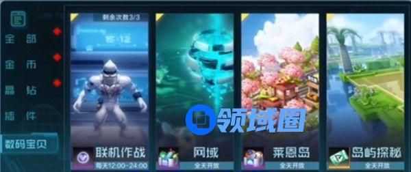 点击玩法,进入玩法界面。可以看到插件选项下面有一个数码宝贝选项,岛屿探秘就在里面。进入岛屿探秘之后,可以看到岛屿探秘有三个副本,分别是渔之岛,歌之岛和雪之牧场。