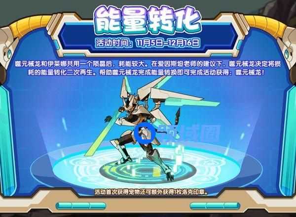 噬元械龙和伊莱娜共用一个陨晶后,耗能较大。在爱因斯坦老师的建议下,噬元械龙决定将损耗的能量转化二次再生。帮助噬元械龙完成能量转换即可完成活动获得:噬元械龙!