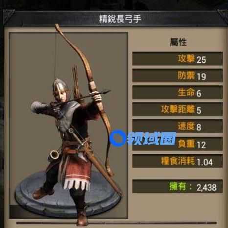 攻击25、防御19、生命6、攻击距离5、速度8、负重12、粮食消耗1.04。