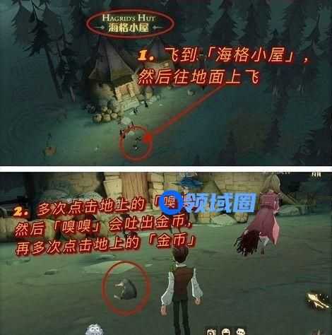 玩家们根据提示来到「海格小屋」门外,多次点击地面上的「嗅嗅」,然后「嗅嗅」会吐出「金币」,再多次点击地上的「金币」(看图中箭头所指的位置)。