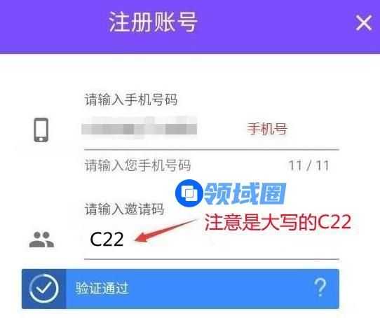 输入你的手机号,重点来了。邀请码:C22,然后点击下面的验证。