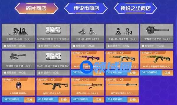 4、道具碎片兑换:各道具碎片为页面积分非游戏道具,不会发放游戏。每个道具对应的道具碎片不同且兑换所需数量也不同,对应碎片集齐后需要玩家去兑换商店手动兑换对应道具奖励。注意:兑换区道具均需获取对应数量的碎片才可获取,且必须达到规定等级