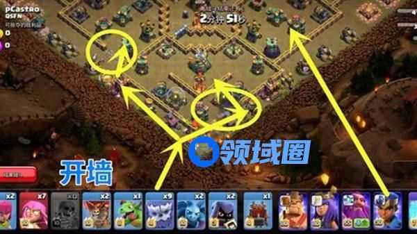 1、首先在9点钟投石炮的区域用“超级炸弹人”开墙,然后在6点钟方向“天鹰火炮”的区域用“超级炸弹人”开墙,因为这两个区域要用大部队进攻,炸开城墙能起到引导作用,而3点钟方向的“投石炮”我们就用闰土加上“骷髅法术”来解决,这就是我们的进攻思路。
