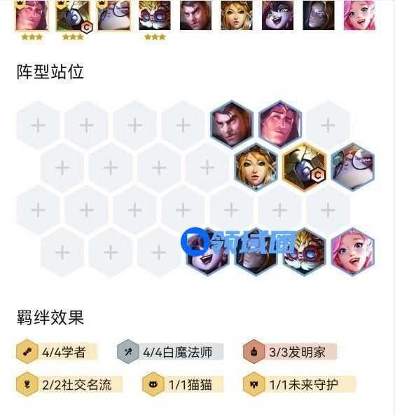 成型阵容为冰女猫猫大头风女四学者固定,搭配方案不定看来牌,谁星级高上谁,可以发条、塞勒芬妮水晶凑白魔和社交名流,水晶当前排吃龙牙反甲,也可以上杰斯出发明家当前排,或者是二星加里奥挂前排,甚至约德尔人白嫖的薇古丝够多d冰女顺便三了也可以吃前排防装,优先级三星水晶>三星薇古丝>二星杰斯>二星加里奥。这套阵容利用的是冰女的高暴发以及自身技能机制范围大而且保命能力强的特点。大成在当前天梯没有天敌,难点在于装备要求高,但变阵灵活,主要目前基本没同行,又克制大部分阵容,学会即上分。