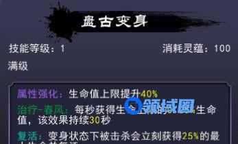 最大限度的提升自身生命上限。点出提升双抗和物理、法术攻击的天赋,提升血的质量。点出天赋强-归元,则能根据自身生命上限来回复生命值。与此同时,九元苏生中的治疗效果也是根据生命上限获得生命值的。在变身状态下被击杀还能复活。血多、肉厚、能恢复、能复活,盘古可以充分的吸引火力,为后排输出提供良好的环境。