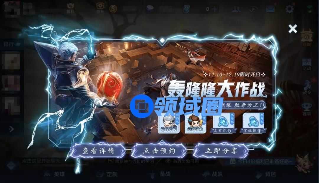 全新玩法轰隆隆大作战即将上线!预约、分享玩法送限时表情好礼!玩法开启后参与玩法领取限时语音好礼!后续玩法将会在后面公布,敬请期待。
