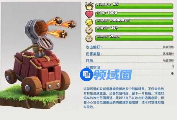 解锁“攻城烈焰车”需要小伙伴们把“攻城机器工坊”提升到6级,全新的“攻城烈焰车”每秒伤害值165、生命值2000、训练费用10万金币、持续时间125秒、训练时间20分钟、攻击偏好防御建筑、伤害类型区域溅射、移动速度6。