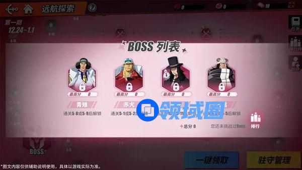 -船长们可以消耗远航券,选择不同的路线挑战关卡,不同路线的关卡有不同的关卡效果。挑战每条路线终点的Boss可以获得积分,根据每期Boss的积分总和进行排名,结算奖励。