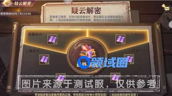 完成【夜之篇章】故事阅读,又通过【寻物搜证】获取额外线索后,可前往【疑云解密】模块回答六个疑云碎片的问题,并最终全服票选【幕后主使】(为了保证不影响个人判断,界面不做票选情况公示)。首次完成答案提交即可领取丰富的绸缎奖励。