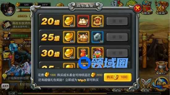 玩家达到21级时会开启成长基金并成为VIP3时,只要花1000元宝购买,之后即可根据到达等级领取相应奖励。