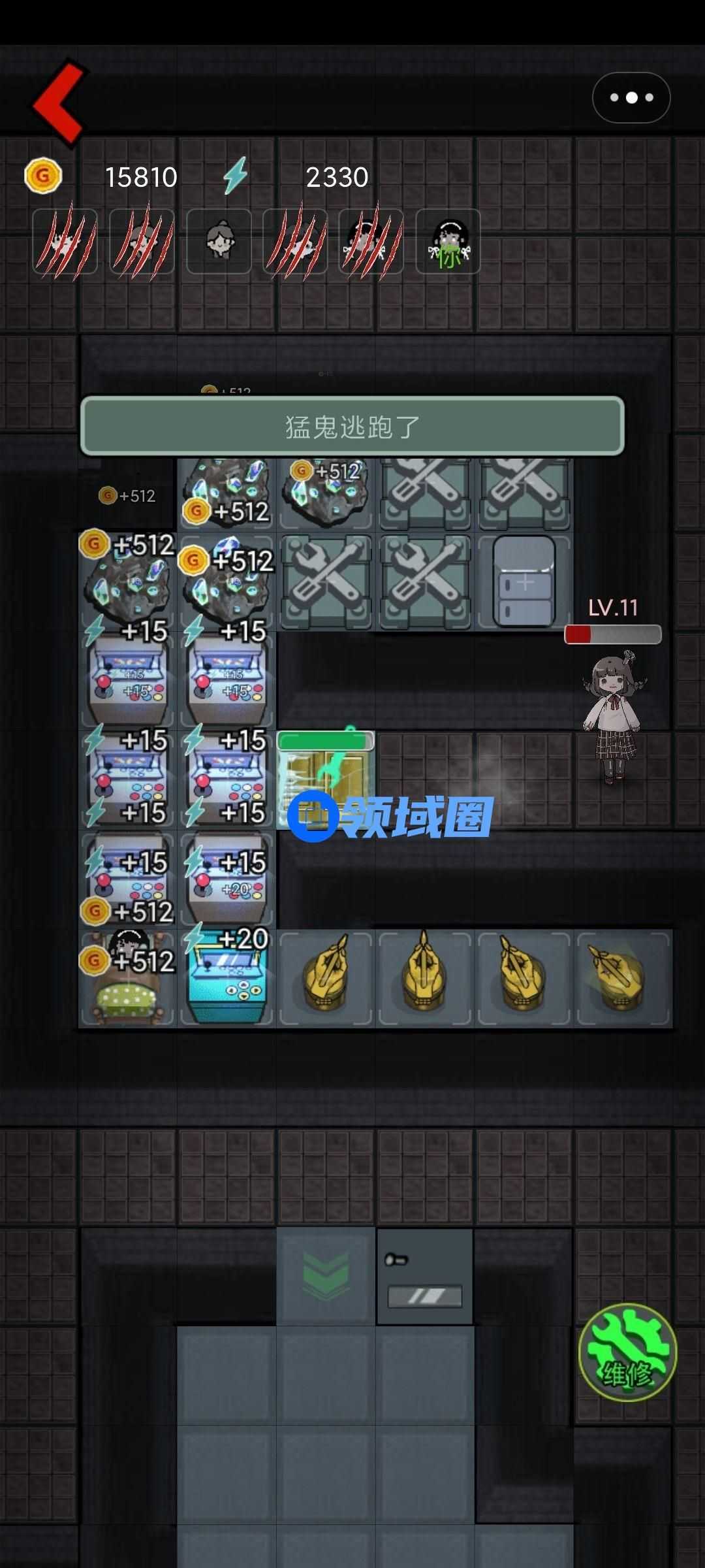 小游戏上玩到,基本情况,前期杀掉鬼,前期被鬼杀掉,道具只有后期摆的起,根据我个人情况,后期单挑鬼还是能打过的,26格的房子除了加攻击范围的道具我都摆满了,满级门圣光炮,单挑11级鬼,我不知道有没有十二级因为没见过,11级鬼是可以打过的但是已经吃力了,满级门也扛不住鬼伤害。推荐选格子多的宿舍这样后期摆道具能方便点,只能玩人不能当鬼,除了自己都是ai,我甚至看到ai门还是钢的床已经满级了,床满级前提是振金门。一局游戏除了你全是ai.前期苟活下来都是稳赢的。